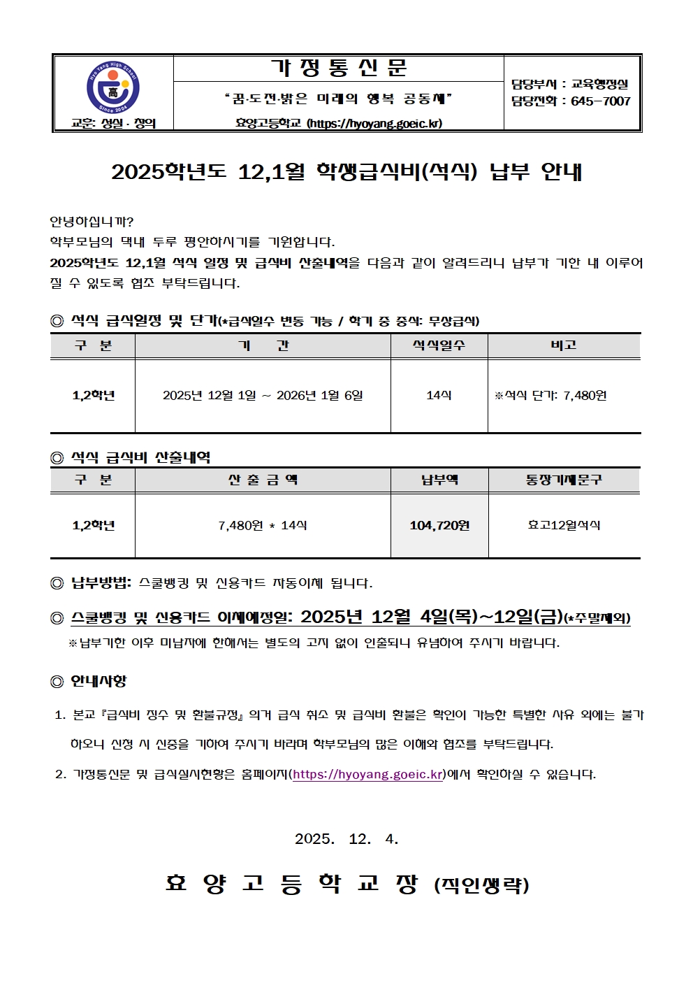 2025학년도 12,1월 학생급식비 석식 납부안내
