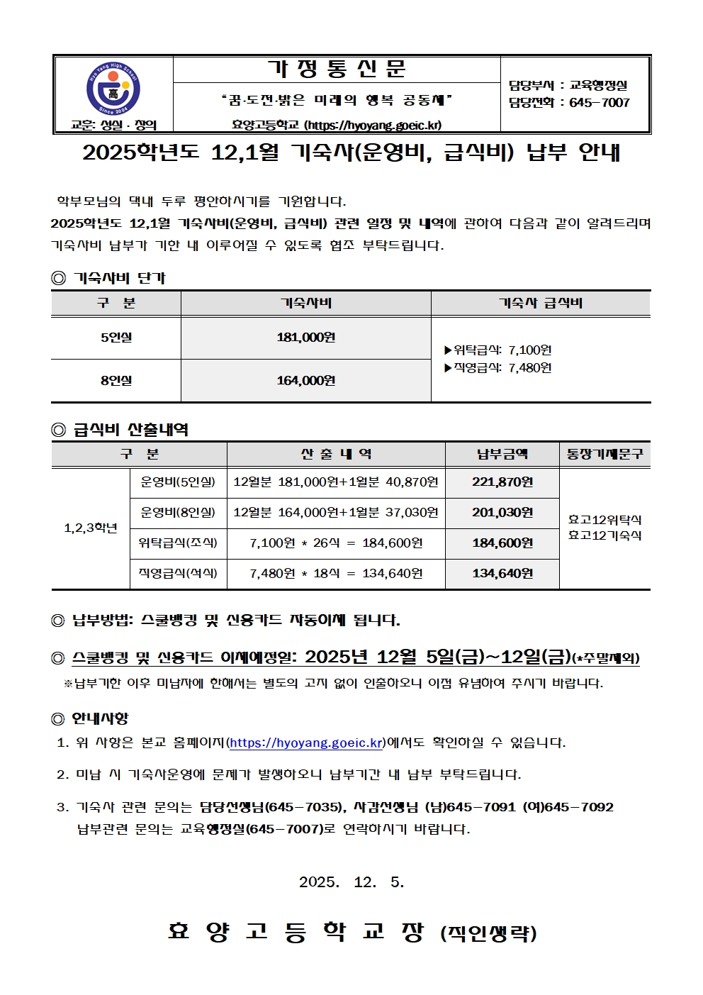 2025학년도 12,1월 기숙사비(운영비, 급식비) 납부안내